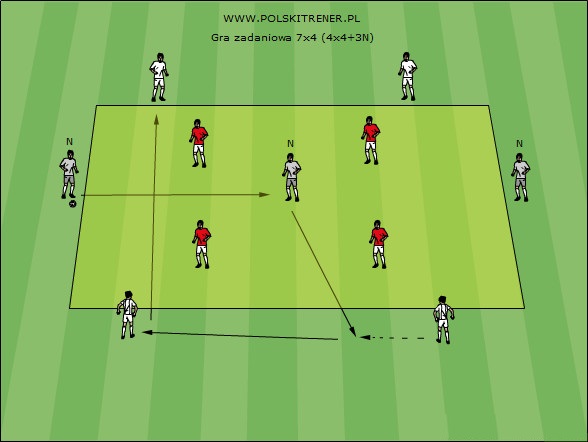 Zawodnicy ustawieni jak na rysunku. Sekwencja zadań według rysunku. Zawodnicy podzieleni na dwa zespoły 4×4 + 3 zawodników neutralnych. Gra prowadzona jest w przewadze 7×4 na wyznaczonym polu (4 atakujących biali + 4 broniących (czerwoni) + 3 zawodników Neutralnych (szare koszulki). Zadaniem zespołu przy piłce jest gra na utrzymanie na 2 kontakty 7×4. Po odbiorze piłki przez broniących, następuje zamiana ról z atakującymi. Zawodnicy Neutralni są stali. Czas ćwiczenia określa trener.