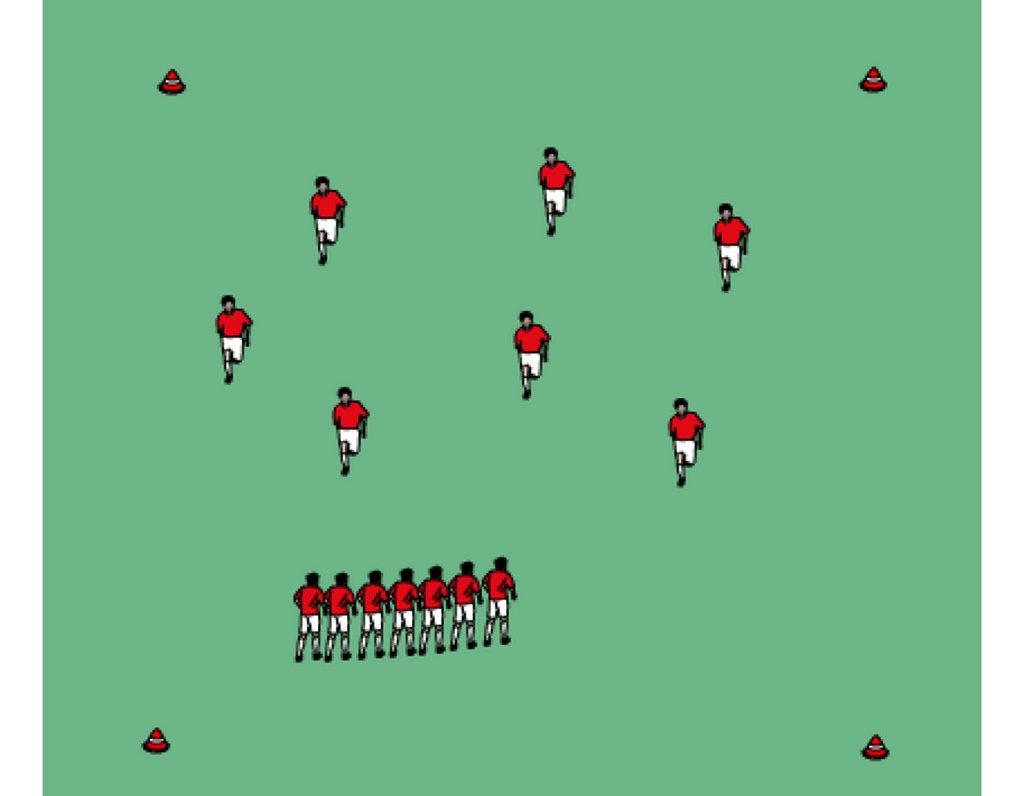 Rozgrzewka z podaniem do boku Ćwiczenie: Opis ćwiczenia: Miejsce: Boisko, sala gimnastyczna, Przybory: piłka, pachołki, Przebieg ćwiczenia: Ćwiczący podzieleni na dwie grupy. Zawodnicy wykonują podania między sobą, podając piłkę do boku między pachołkami. Przy przebieganiu w stronę drugiej grupy trenujący wykonują ćwiczenia ogólnorozwojowe. Odmiany: – podania z przyjęciem lub bez przyjęcia piłki, Legenda do ćwiczeń: