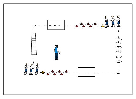 Zawodnicy ustawieni jak na rysunku. Sekwencja zadań według rysunku. Ćwiczenie wykonywane jest w obiegu. Zawodnicy podzieleni na dwie grupy pokonują tor przeszkód wykonując kolejno: bieg przez płotki z wysokim unoszeniem kolan, przetoczenie przez materac, praca na drabince/kołach.