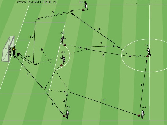 Zawodnicy ustawieni jak na rysunku. Sekwencja zadań według rysunku. Ćwiczenie rozpoczyna Bramkarz, który podaje do A1. Ćwiczący A1 wymienia podanie z B1, po czym wykonuje podanie do C1. Zawodnik C1 podaje do C2, a ten wymienia podanie z A2 i gra do wbiegającego na dośrodkowanie zawodnika B2. Ćwiczący B2 wykonuje dośrodkowanie do jednego z napastników A1-A2, którzy po zmianie krzyżowej kończą sekwencję zadań strzałem na bramkę. Zmiany zadań ćwiczących w parach: A1-A2 / B1-B2/ C1-C2.